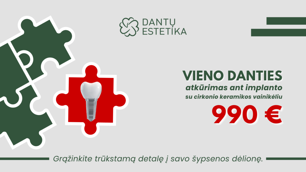 990 € – tai galutinė kaina už pilną vieno danties atkūrimą.